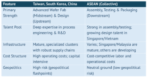 Strategic Insight: ASEAN cannot immediately compete with Taiwan or Korea on advanced node fabrication. Its competitive edge lies in neutrality, cost-efficiency, and downstream excellence, with a gradual climb toward midstream manufacturing.