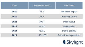 - Some government sources and officials have stated production figures ranging between 70–160 tonnes per year, depending on reporting methodology, mine performance, and inclusion of copper–gold co-products.