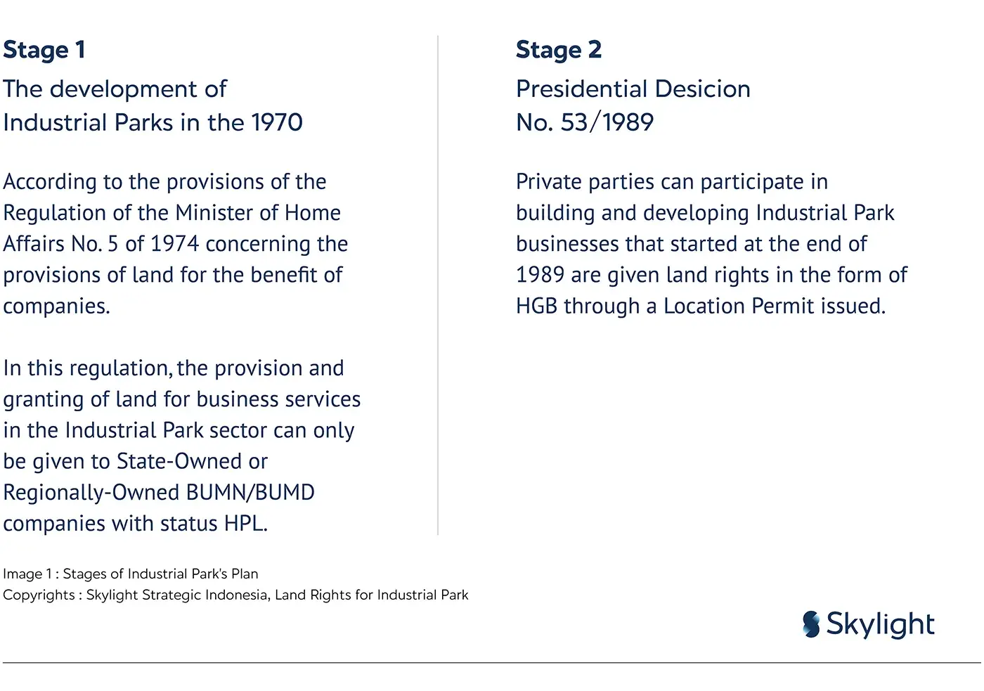 2. Industrial Parks managed by private companies are granted land rights in the form of Right to Build (HGB). This means the company that owns the Industrial Park has full ownership of the land. From this main HGB, the company can divide the land and grant HGB rights to industrial tenants within the Industrial Park. These tenants acquire land rights through a Sale and Purchase Agreement (AJB), allowing them to own fixed assets for a set period.