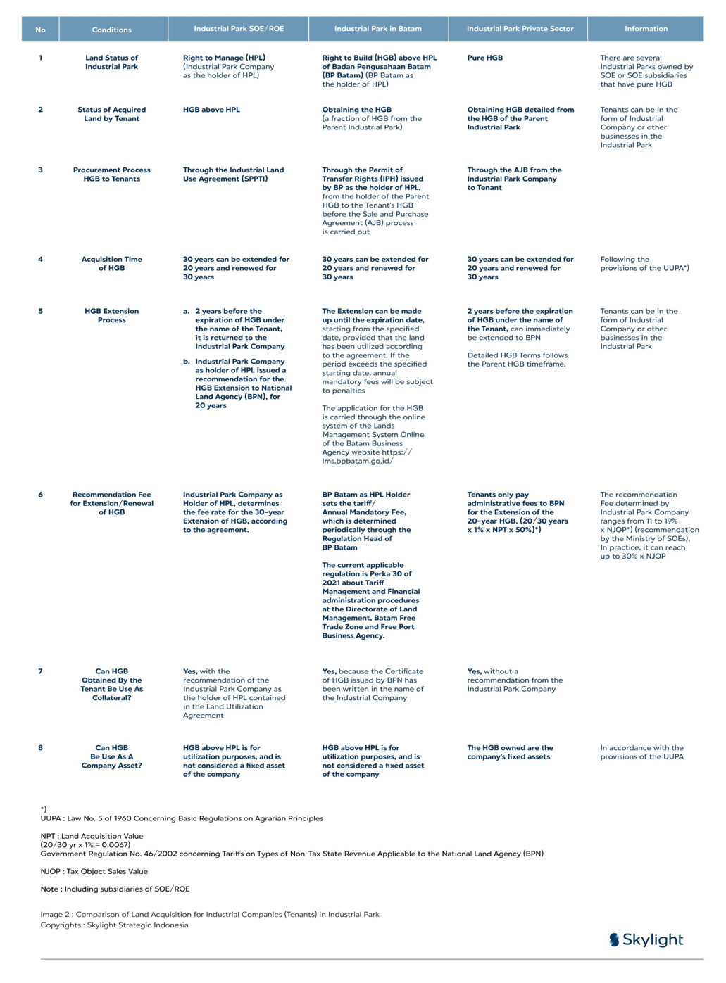 1. Industrial Parks whose shares are owned by the Government / Regional Government in the form of SOEs / ROEs, generally get land rights in the form of Right to Manage (HPL). Thus, the Industrial Park Company as the holder of HPL represents the State/Regional assets. From the HPL controlled by the Industrial Park company, Right to Build (HGB) can be granted to the companies within the area (known as tenants). This is formalized through an Industrial Land Use Agreement (SPPTI), which is a contractual agreement between the Industrial Park company and the tenants, outlining the terms of land use. It’s important to note that industrial companies in these Industrial Parks are not the owners of the land. Instead, they are beneficiaries with land use rights as outlined in the SPPTI, meaning the land is not considered a fixed asset of the company.