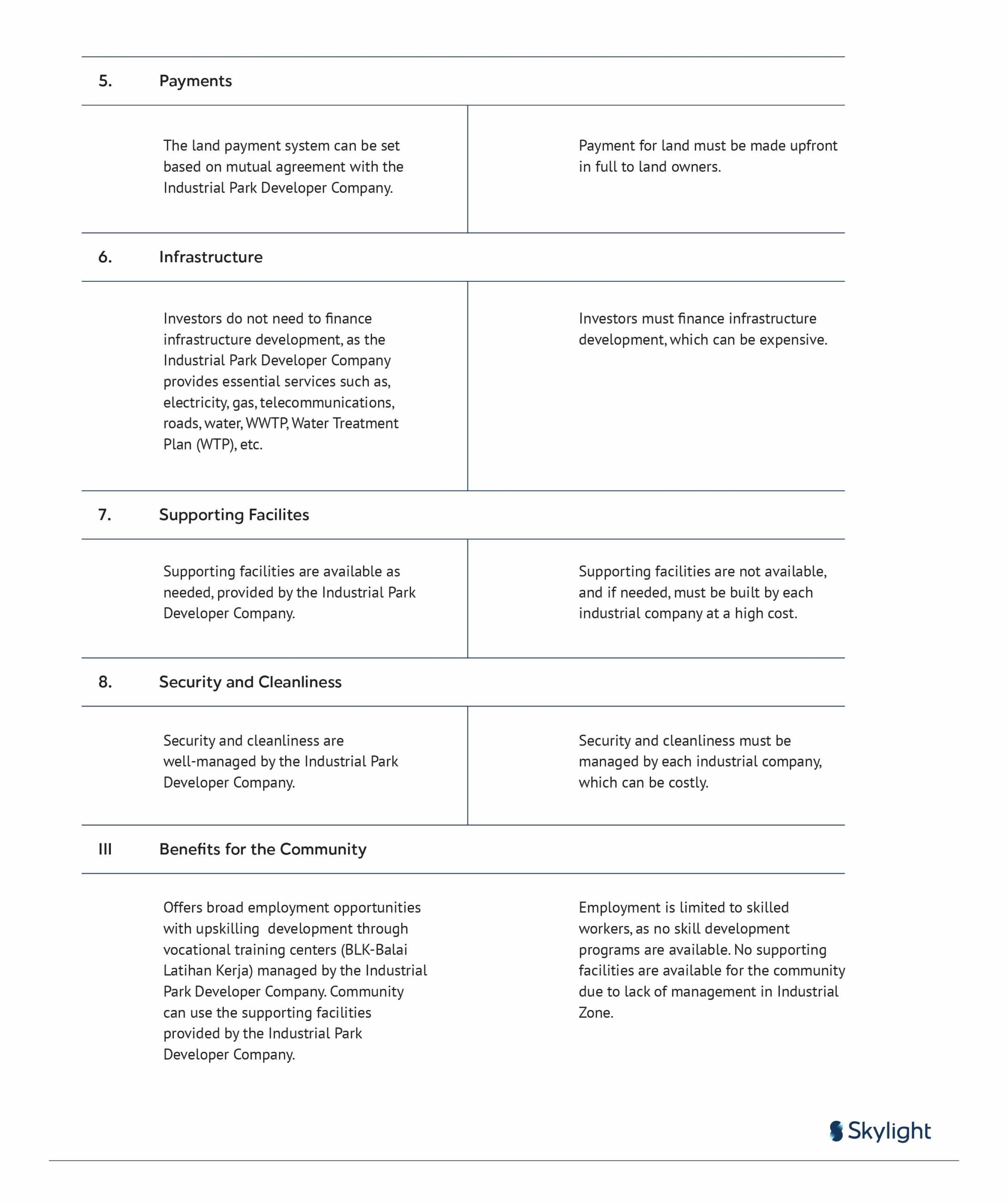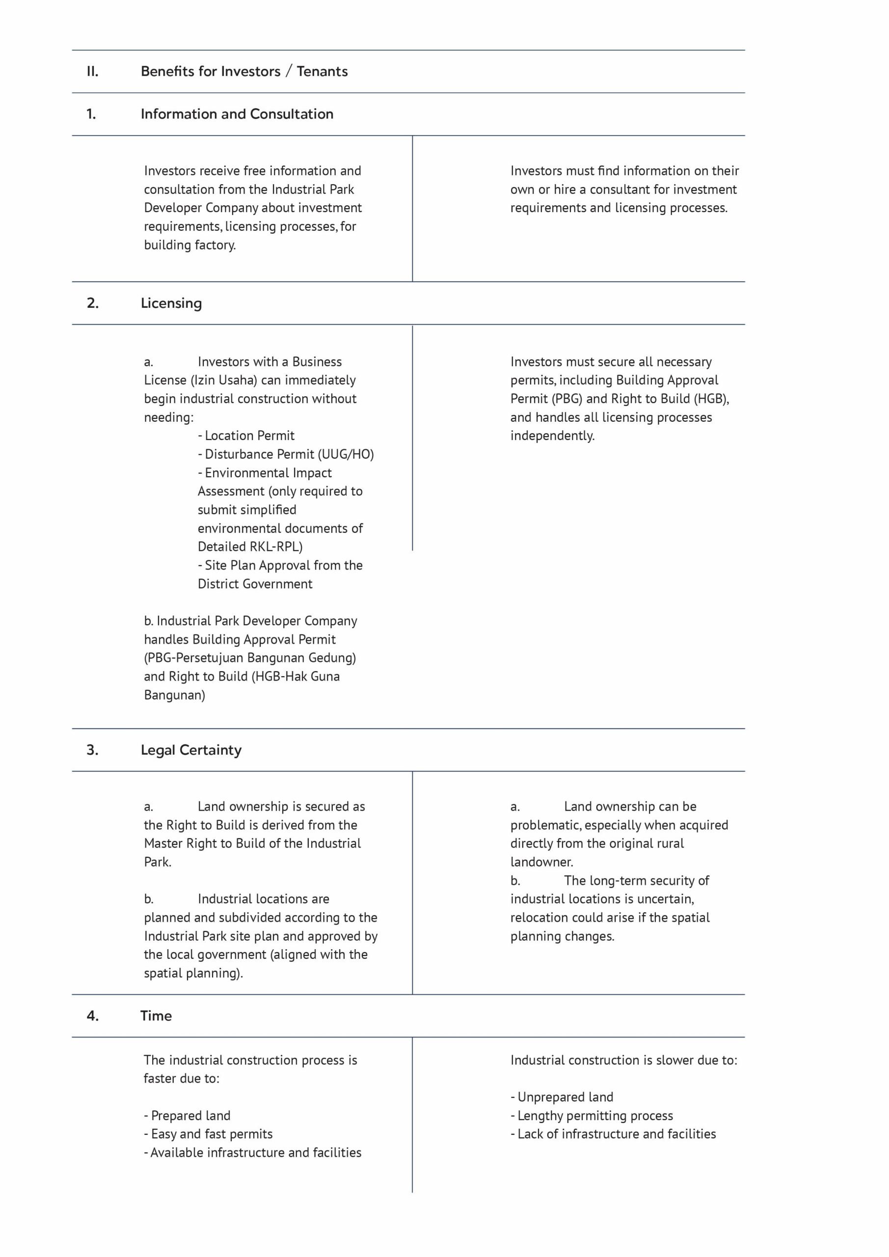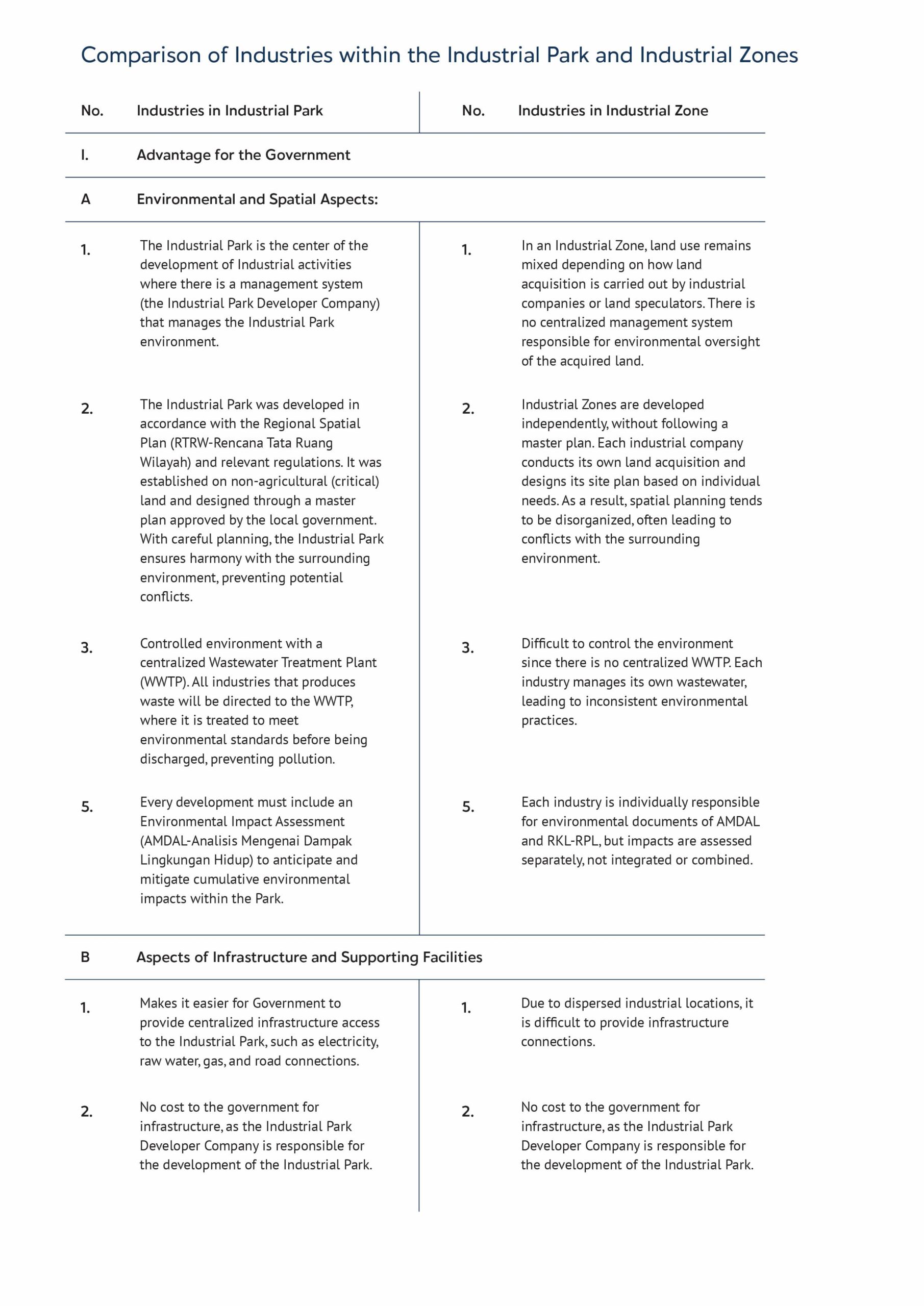 This distinction clarifies the differences between Industrial Designation Areas, Industrial Zones and Industrial Parks. However, a common misconception remains—many still believe that industries operating outside of an Industrial Park are automatically located in an Industrial Zone. To better understand this, a detailed comparison can be made between industries inside and outside Industrial Parks, along with the benefits for the government, investors (tenants), and the community: